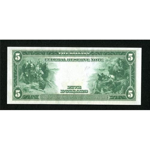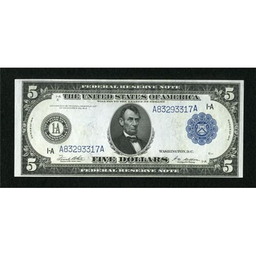 <B>Fr. 847a $5 1914 Federal Reserve Note Choice New.</B></I> Dark inks, bright paper, embossing, and natural paper surfaces are highlights of this Boston $5.<BR><BR><b>Shipping:</b> Coins & Currency (<a target="_blank" href="http://www.heritageauctions.com/common/shipping.php">view shipping information</a>)