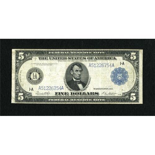<B>Fr. 847a $5 1914 Federal Reserve Note Fine-Very Fine.</B></I> There is a slight nick in the lower left hand margin.<BR><BR><b>Shipping:</b> Coins & Currency (<a target="_blank" href="http://www.heritageauctions.com/common/shipping.php">view shipping information</a>)
