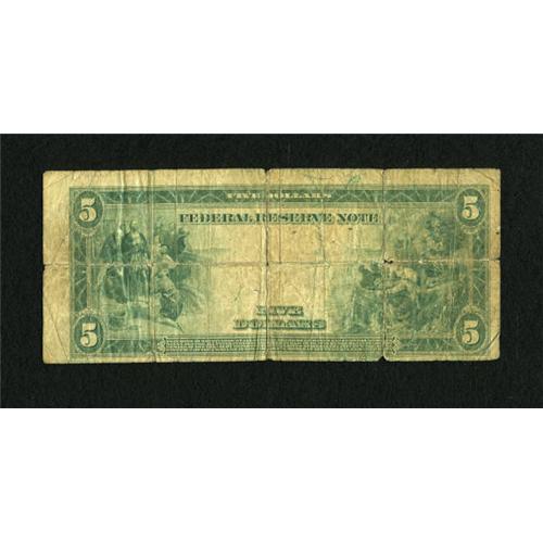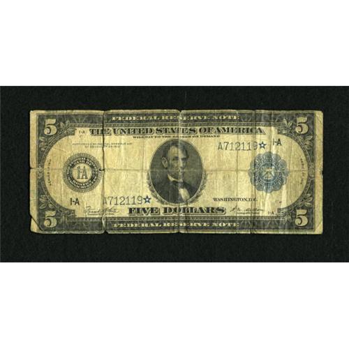 <B>Fr. 847a $5 1914 Federal Reserve Star Note Good.</B></I> There were only 17 Stars listed in the Murray census for this Friedberg number before the appearance of this note. This note was once folded into eighths and carried in a wallet in that manner for a long period of time. This action left internal splits along the folds plus some edge splits with the longest two being approximately a half an inch and an inch.<BR><BR><b>Shipping:</b> Coins & Currency (<a target="_blank" href="http://www.heritageauctions.com/common/shipping.php">view shipping information</a>)