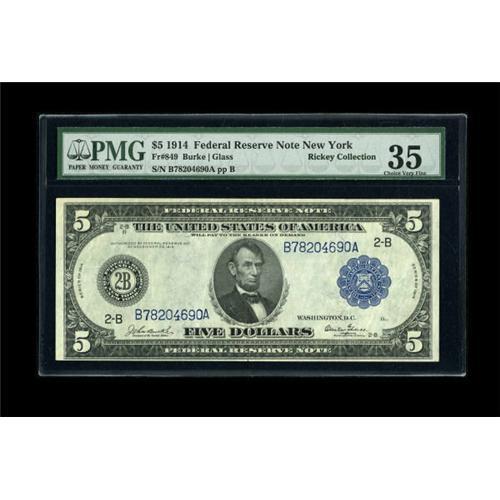 <B>Fr. 849 $5 1914 Federal Reserve Note PMG Choice Very Fine 35.</B></I> An attractive issue with the less commonly seen Burke-Glass signature combination.<BR><BR><b>Shipping:</b> Coins & Currency (<a target="_blank" href="http://www.heritageauctions.com/common/shipping.php">view shipping information</a>)