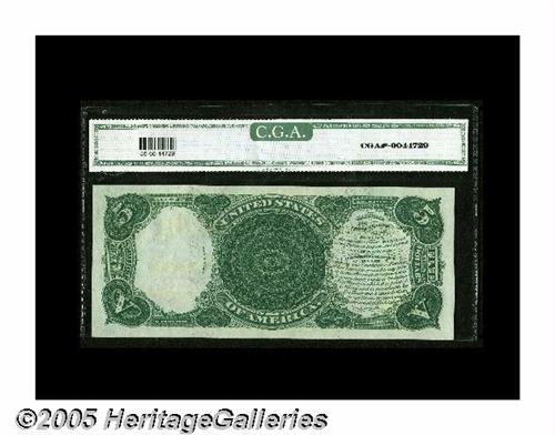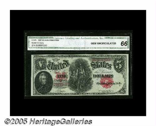 <B>Fr. 85 $5 1907 Legal Tender CGA Gem Uncirculated 66.</B></I> An absolutely gorgeous Pioneer $5 whose deep original embossing is easily seen through the graded holder.