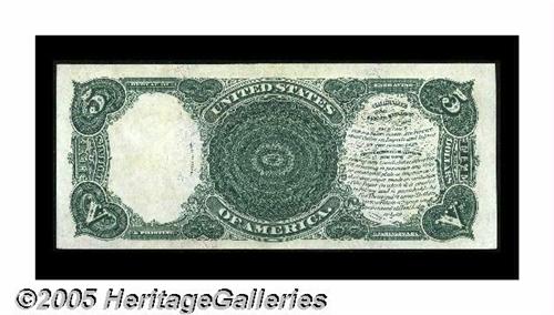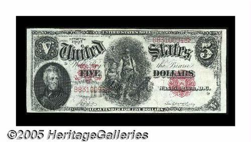 <B>Fr. 85 $5 1907 Legal Tender Choice About New.</B></I> Nice margins encircle this Woodchopper that has a light center fold.