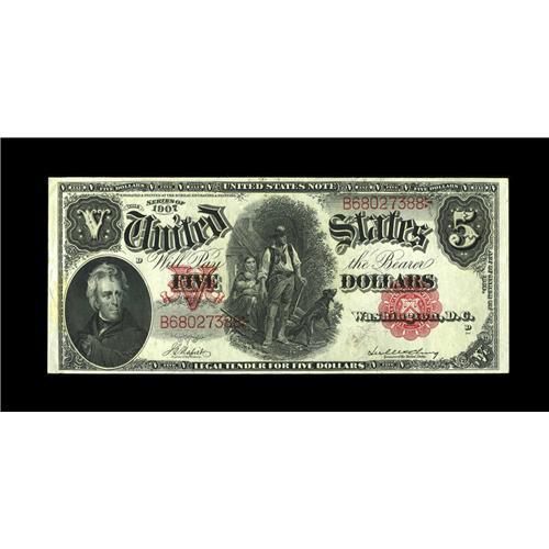 <B>Fr. 85 $5 1907 Legal Tender Extremely Fine-About New.</B></I> Paper originality is not in question as this example still looks as nice as the day it was printed with only a few folds and a light discoloration at left visible.