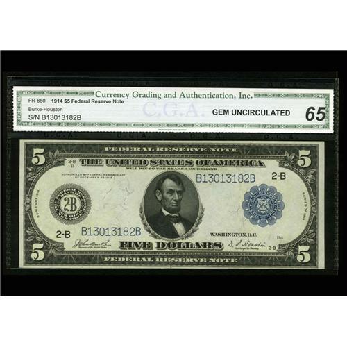 Fr. 850 $5 1914 Federal Reserve Note CGA Gem 65 Fr. 850 $5 1914 Federal Reserve Note CGA Gem Uncircu
