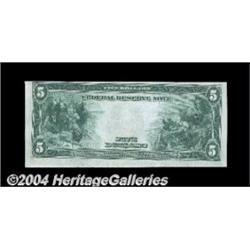 Fr. 850 $5 1914 Federal Reserve Note Very Choice New. A Gem but for the back centering. A common number, and an inexpensive way to acquire the Burke-Houston signature combination. <BR><BR><B>Important notice:</B> Heritage usually auctions material at the rate of 200-250 lots per hour. On some occasions eBay Live bid software or the Internet may not be able to keep up with the pace of the auction. We recommend placing a realistic absentee bid now as insurance to avoid disappointment. Occasionally the auctioneer may eliminate or reject an eBay Live bid, and the auctioneer may also reopen a lot after the close of the eBay live bidding (usually because we missed an audience bid), and may reject your bid even if it shows you as the winning bidder. By bidding via eBay Live, you agree that Heritage may award the lot to another bidder at its sole discretion under the circumstances described above or any other reasonable circumstances. Since eBay bids are not shown to us until we open the lot on the floor, we treat those bids just like floor bids. In most cases the floor responds before the eBay bid is presented to us, due to Internet lag time, so for consistency we have made it a policy that floor bids are always considered first over tie eBay live bids. Also please note that all Heritage lots purchased through eBay Live carry a 20% Buyer's Premium. Please make sure you read the Terms and Conditions before you bid. <BR><BR><B>IMPORTANT ANNOUNCEMENT ABOUT RESERVES:</B> Heritage now divulges all reserves on its web site 7 days before every auction. If you want to know whether the reserve on this lot has been met, and if not, what the reserve amount is, please visit this lot page on the HeritageCoin.com web site, or email: bid@HeritageGalleries.com