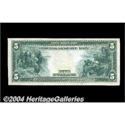 Fr. 850 $5 1914 Federal Reserve Note Very Choice New. Good original embossing, perfect colors and rather nice margins. One of the more common Five Dollar Feds, with nearly 100 examples known. <BR><BR><B>Important notice:</B> Heritage usually auctions material at the rate of 200-250 lots per hour. On some occasions eBay Live bid software or the Internet may not be able to keep up with the pace of the auction. We recommend placing a realistic absentee bid now as insurance to avoid disappointment. Occasionally the auctioneer may eliminate or reject an eBay Live bid, and the auctioneer may also reopen a lot after the close of the eBay live bidding (usually because we missed an audience bid), and may reject your bid even if it shows you as the winning bidder. By bidding via eBay Live, you agree that Heritage may award the lot to another bidder at its sole discretion under the circumstances described above or any other reasonable circumstances. Since eBay bids are not shown to us until we open the lot on the floor, we treat those bids just like floor bids. In most cases the floor responds before the eBay bid is presented to us, due to Internet lag time, so for consistency we have made it a policy that floor bids are always considered first over tie eBay live bids. Also please note that all Heritage lots purchased through eBay Live carry a 20% Buyer's Premium. Please make sure you read the Terms and Conditions before you bid. <BR><BR><B>IMPORTANT ANNOUNCEMENT ABOUT RESERVES:</B> Heritage now divulges all reserves on its web site 7 days before every auction. If you want to know whether the reserve on this lot has been met, and if not, what the reserve amount is, please visit this lot page on the HeritageCoin.com web site, or email: bid@HeritageGalleries.com