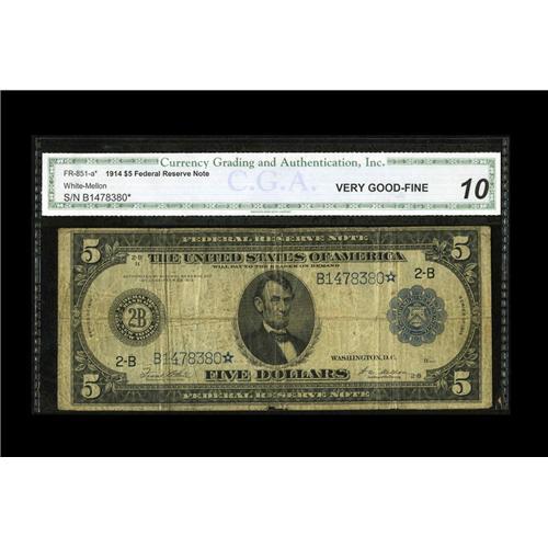 <B>Fr. 851a $5 1914 Federal Reserve Note CGA Very Good-Fine 10.</B></I> Although this is the most common 1914 $5 Federal Reserve Star Note it is no easy find, with 51 examples reported in the Douglas D. Murray book. A small bit of the bottom margin is missing though the intrusion does not touch the design.