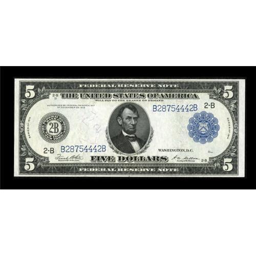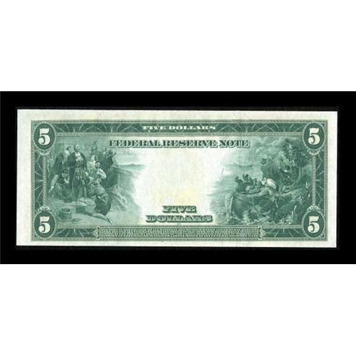 <B>Fr. 851a $5 1914 Federal Reserve Note Gem New.</B></I> Very natural with wonderful bold embossing and centering commensurate with the grade. Wonderful paper wave and bright inks are sure to please.<BR><BR><b>Shipping:</b> Coins & Currency (<a target="_blank" href="http://www.heritageauctions.com/common/shipping.php">view shipping information</a>)