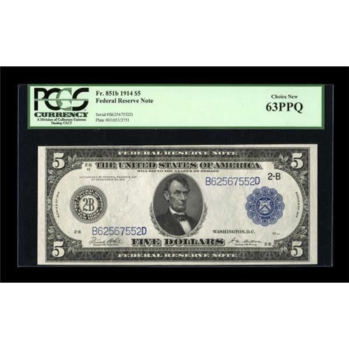 <B>Fr. 851b $5 1914 Federal Reserve Note PCGS Choice New 63PPQ.</B></I> All the right paper waves are seen in all the right places. The texture of the paper is ideally original.<BR><BR><b>Shipping:</b> Coins & Currency (<a target="_blank" href="http://www.heritageauctions.com/common/shipping.php">view shipping information</a>)