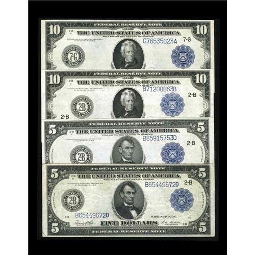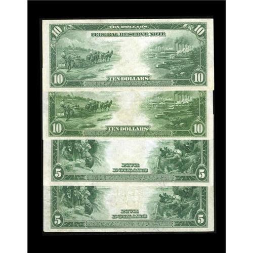 <B>Fr. 851b $5 1914 Federal Reserve Note VF.</B></I><B>Fr. 851c $5 1914 Federal Reserve Note XF.</B></I><B>Fr. 911c $10 1914 Federal Reserve Note XF.</B></I> <B>Fr. 931a $10 1914 Federal Reserve Note CU.</B></I> This is a nice looking group of tougher Blue Seal FRN's.<BR>