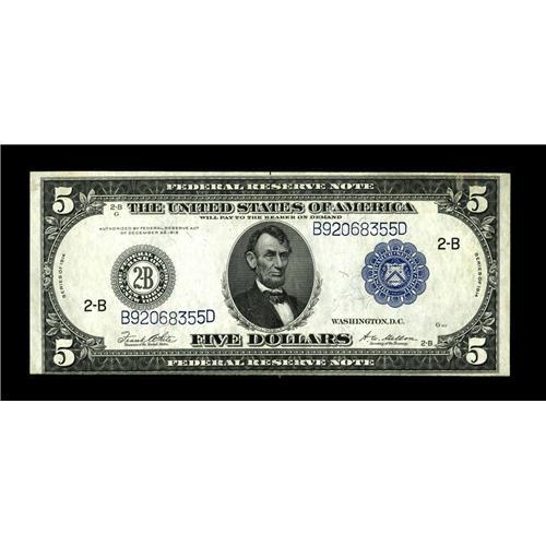 <B>Fr. 851c $5 1914 Federal Reserve Note New.</B></I> Embossing remains strong on this colorful "c" variety. A touch more margin and a bit less handling and this makes the choice grade.<BR><BR><b>Shipping:</b> Coin/Currency (<a target="_blank" href="http://www.heritageauctions.com/common/shipping.php">view shipping information</a>)