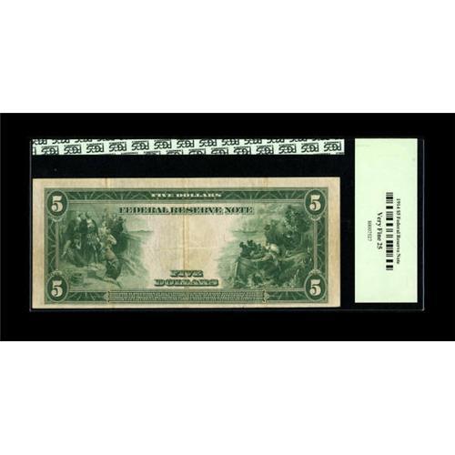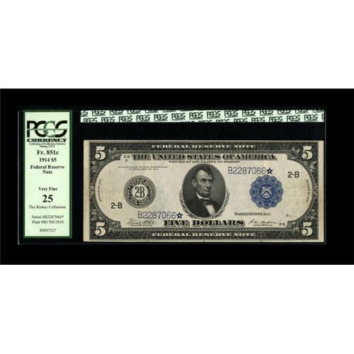 <B>Fr. 851c $5 1914 Federal Reserve Star Note PCGS Very Fine 25.</B></I> This star will increase the census to 18, but only six of those notes grade higher than this nice mid-grade example.<BR><BR><b>Shipping:</b> Coins & Currency (<a target="_blank" href="http://www.heritageauctions.com/common/shipping.php">view shipping information</a>)
