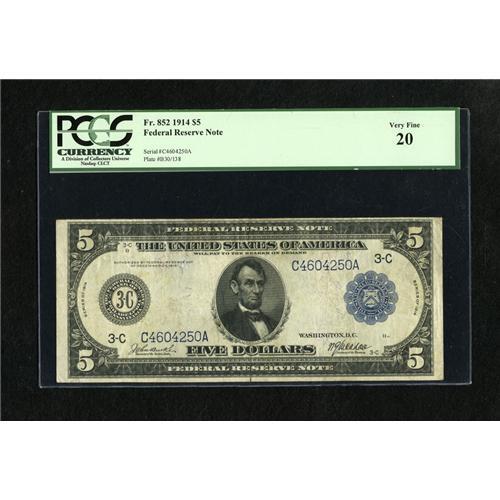 <B>Fr. 852 $5 1914 Federal Reserve Note PCGS Very Fine 20.</B></I> This newly found note is not recorded in any census data. Problem free with some crispness left.<BR><BR><b>Shipping:</b> Coins & Currency (<a target="_blank" href="http://www.heritageauctions.com/common/shipping.php">view shipping information</a>)