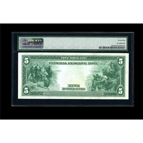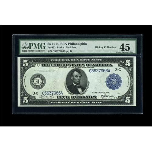 <B>Fr. 852 $5 1914 Federal Reserve Note PMG Choice Extremely Fine 45.</B></I> This Philly $5 note is deeply inked and evenly margined.<BR><BR><b>Shipping:</b> Coins & Currency (<a target="_blank" href="http://www.heritageauctions.com/common/shipping.php">view shipping information</a>)
