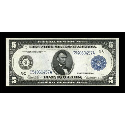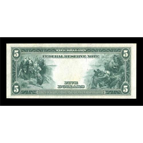 <B>Fr. 855a $5 1914 Federal Reserve Note Choice New.</B></I> Some embossing remains visible on this Philly note that has a corner bump which does not enter the design.<BR><BR><b>Shipping:</b> Coins & Currency (<a target="_blank" href="http://www.heritageauctions.com/common/shipping.php">view shipping information</a>)