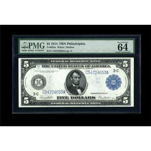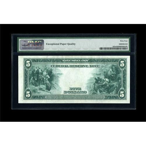<B>Fr. 855a $5 1914 Federal Reserve Note PMG Choice Uncirculated 64 EPQ.</B></I> Broad margins are noted, much larger than usually encountered on Very Choice specimens. The embossing is bold and the paper is perfectly original.<BR><BR><b>Shipping:</b> Coins & Currency (<a target="_blank" href="http://www.heritageauctions.com/common/shipping.php">view shipping information</a>)