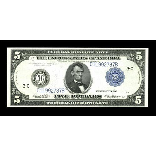 <B>Fr. 855c $5 1914 Federal Reserve Note Choice New.</B></I> A high grade example of the scarce "Type c" Federal Reserve Note, one of a consecutive pair from the Philadelphia district offered here.<BR><BR><b>Shipping:</b> Coin/Currency (<a target="_blank" href="http://www.heritageauctions.com/common/shipping.php">view shipping information</a>)