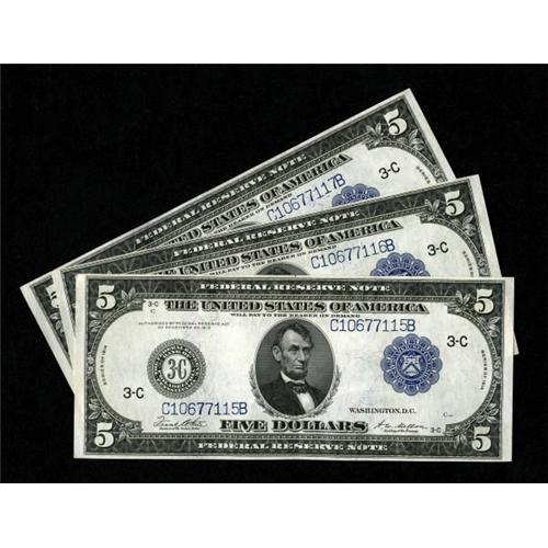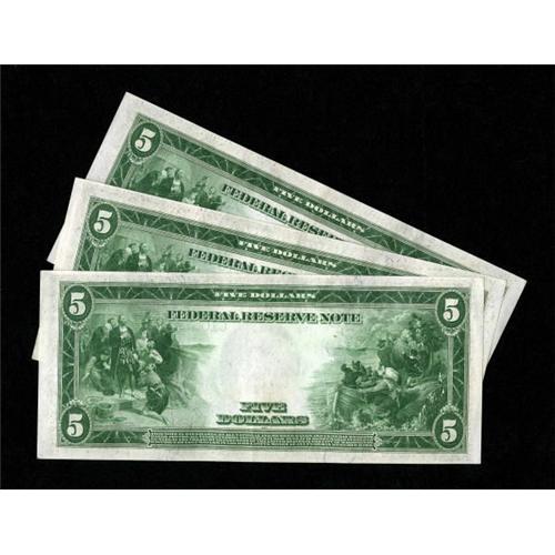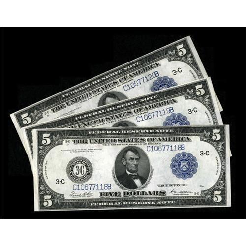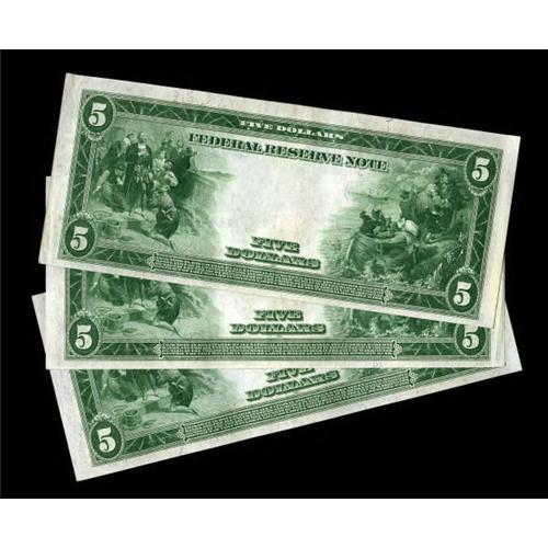 <B>Fr. 855c $5 1914 Federal Reserve Notes Six Consecutive Examples Choice About New.</B></I> A cut sheet is contained within this pleasing grouping. Plenty of original embossing remains with bright color. Without the soft center fold these notes would certainly grade choice new.<BR><BR><b>Shipping:</b> Coins & Currency (<a target="_blank" href="http://www.heritageauctions.com/common/shipping.php">view shipping information</a>)