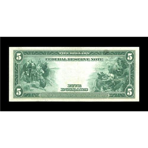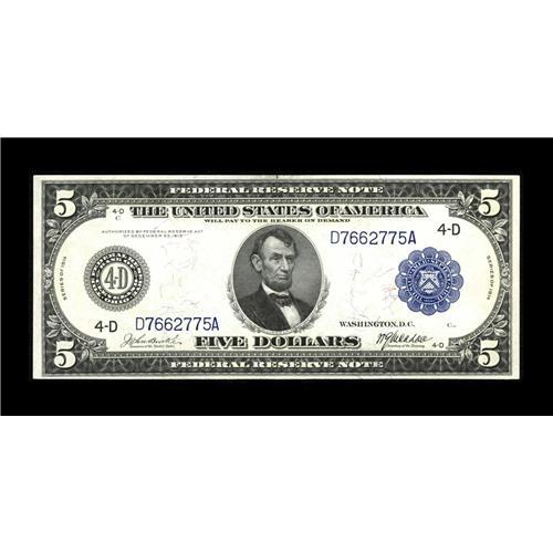 <B>Fr. 856 $5 1914 Federal Reserve Note About New.</B></I> A light center fold can be seen mainly on the back of this gorgeous Fed that is bright white. Well margined with decent centering, this is a somewhat more elusive issue from Cleveland.<BR><I>From The Bill and Kathy Stella Currency Collection</B></I><BR><BR><b>Shipping:</b> Coin/Currency (<a target="_blank" href="http://www.heritageauctions.com/common/shipping.php">view shipping information</a>)