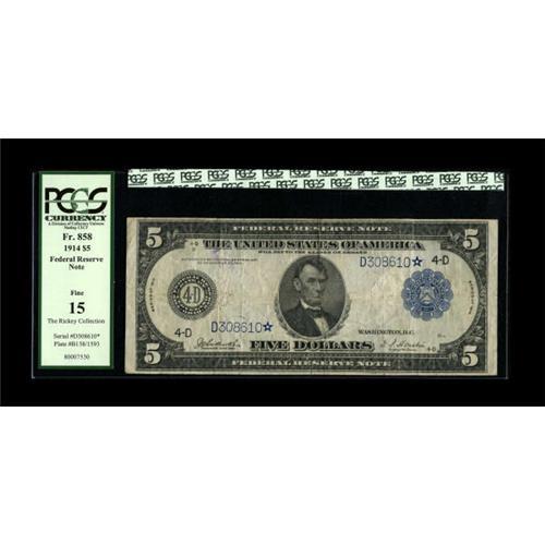 <B>Fr. 858 $5 1914 Federal Reserve Star Note PCGS Fine 15.</B></I> There are just eleven stars in the census for this Friedberg number. This nice mid-grade example with bright paper for the grade is crossing the auction block for the first time.<BR><BR><b>Shipping:</b> Coins & Currency (<a target="_blank" href="http://www.heritageauctions.com/common/shipping.php">view shipping information</a>)
