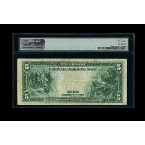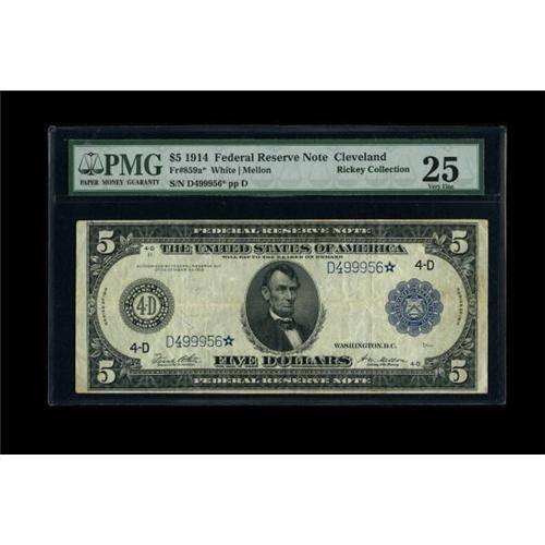 <B>Fr. 859a $5 1914 Federal Reserve Star Note PMG Very Fine 25.</B></I> A pleasing mid-grade star example from the Cleveland district. The note still displays a bit of crispness in the holder.<BR><BR><b>Shipping:</b> Coins & Currency (<a target="_blank" href="http://www.heritageauctions.com/common/shipping.php">view shipping information</a>)