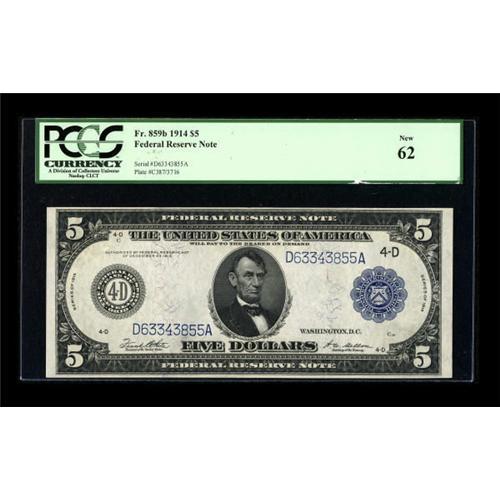 <B>Fr. 859b $5 1914 Federal Reserve Note PCGS New 62.</B></I> Definitely in the top 10% for grade, as not many examples have survived in New condition.<BR><BR><b>Shipping:</b> Coins & Currency (<a target="_blank" href="http://www.heritageauctions.com/common/shipping.php">view shipping information</a>)