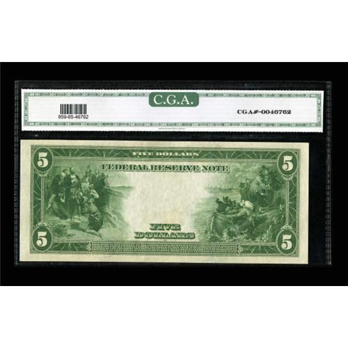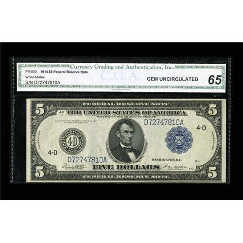 <B>Fr. 859c $5 1914 Federal Reserve Note CGA Gem Uncirculated 65.</B></I> This Cleveland District is actually more common for the "c" type than the "b". The CGA holder simply calls this a Fr. 859, but it is in reality the scarcer (but not in Cleveland) "c" which has the treasury and district seals moved closer to the center.<BR><BR><b>Shipping:</b> Coins & Currency (<a target="_blank" href="http://www.heritageauctions.com/common/shipping.php">view shipping information</a>)