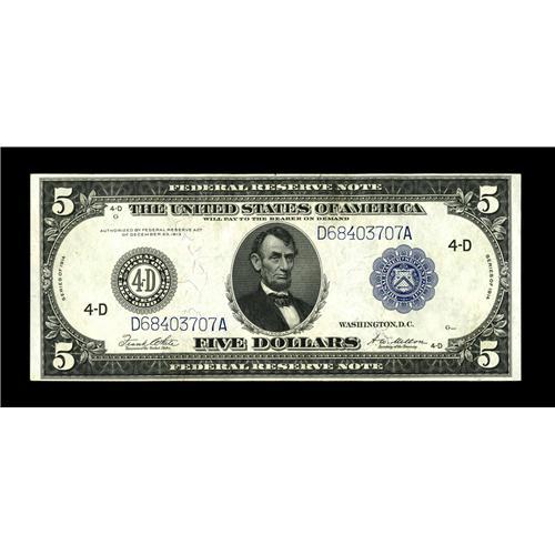 <B>Fr. 859c $5 1914 Federal Reserve Note Very Choice New.</B></I> Perfectly original paper and bold embossing are seen on this "c" variety note. The margins are ever-so-close to Gem.<BR><BR><b>Shipping:</b> Coin/Currency (<a target="_blank" href="http://www.heritageauctions.com/common/shipping.php">view shipping information</a>)