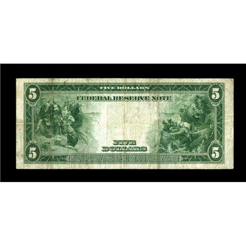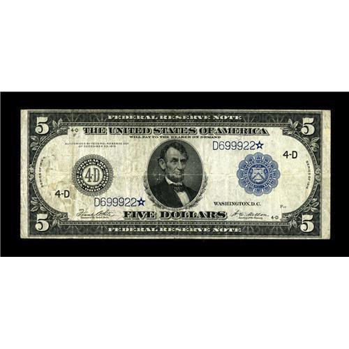 <B>Fr. 859c $5 1914 Federal Reserve Star Note Fine.</B></I> We have handled this number once before albeit in a higher grade. Our consignor has owned this note since June of 1980. Only five examples are known in the Gengerke census with this being the lowest serial known. Normal circulation for the grade has not been too harsh on this tough note.<BR><I>Ex: Doug Murray</B></I><BR><BR><b>Shipping:</b> Coin/Currency (<a target="_blank" href="http://www.heritageauctions.com/common/shipping.php">view shipping information</a>)