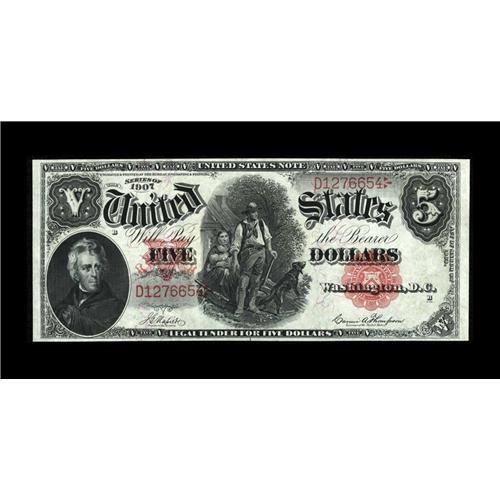 <B>Fr. 86 $5 1907 Legal Tender Choice New.</B></I> This is a well margined, bright example of the popular and scarce Napier-Thompson signature combination Woodchopper. We've sold only 26 examples of this Friedberg number in all our previous auctions dating back to 1990, and only two of those other notes could rival the visual appeal of this delightful piece.<BR><I>From The Bill and Kathy Stella Currency Collection</B></I><BR><BR><b>Shipping:</b> Coin/Currency (<a target="_blank" href="http://www.heritageauctions.com/common/shipping.php">view shipping information</a>)