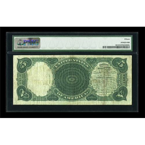<B>Fr. 86 $5 1907 Legal Tender PMG Choice Fine 15.</B></I> This is the scarce Napier-Thompson signature combination. About 50 examples are known in all grades combined, with this average circulated note new to the census. <BR><BR><b>Shipping:</b> Coins & Currency (<a target="_blank" href="http://www.heritageauctions.com/common/shipping.php">view shipping information</a>)