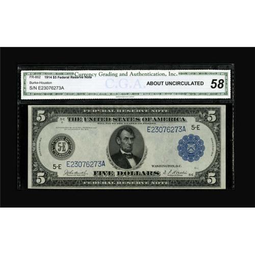 <B>Fr. 862 $5 1914 Federal Reserve Note CGA About Uncirculated 58.</B></I> A lone centerfold separates this note from a full Very Choice grade. Interestingly, the fold is most visible from the back, leaving the face design uninterrupted.<BR><BR><b>Shipping:</b> Coins & Currency (<a target="_blank" href="http://www.heritageauctions.com/common/shipping.php">view shipping information</a>)