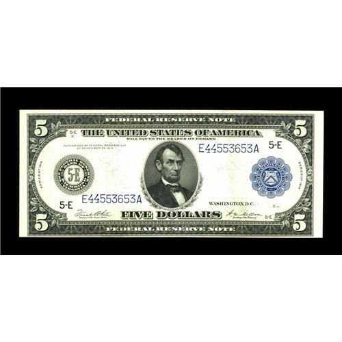 <B>Fr. 863a $5 1914 Federal Reserve Note Choice About New.</B></I> This is a tough note in the high grades. Bright inks grace blast white surfaces.<BR><BR><b>Shipping:</b> Coin/Currency (<a target="_blank" href="http://www.heritageauctions.com/common/shipping.php">view shipping information</a>)