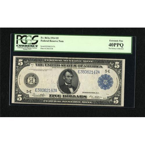 <B>Fr. 863a $5 1914 Federal Reserve Note PCGS Extremely Fine 40PPQ.</B></I> The surfaces are quite bright on this well margined Richmond issue.<BR><BR><b>Shipping:</b> Coins & Currency (<a target="_blank" href="http://www.heritageauctions.com/common/shipping.php">view shipping information</a>)