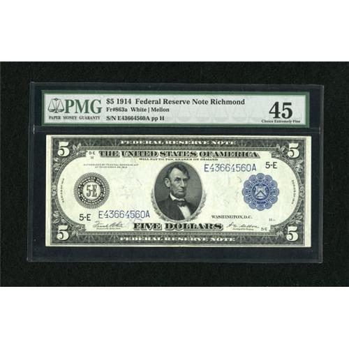 <B>Fr. 863a $5 1914 Federal Reserve Note PMG Choice Extremely Fine 45.</B></I> A clean Richmond note with plenty of eye appeal.<BR><BR><b>Shipping:</b> Coins & Currency (<a target="_blank" href="http://www.heritageauctions.com/common/shipping.php">view shipping information</a>)