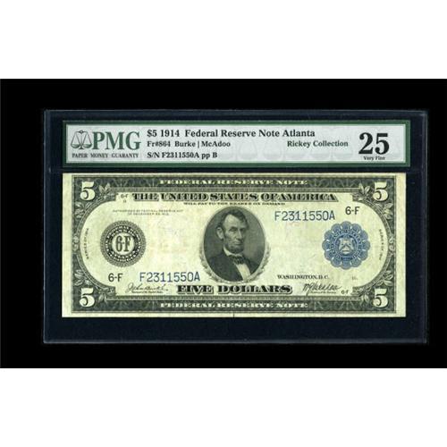 <B>Fr. 864 $5 1914 Federal Reserve Note PMG Very Fine 25.</B></I> Here is a lightly handled note from the popular Atlanta district.<BR><BR><b>Shipping:</b> Coins & Currency (<a target="_blank" href="http://www.heritageauctions.com/common/shipping.php">view shipping information</a>)