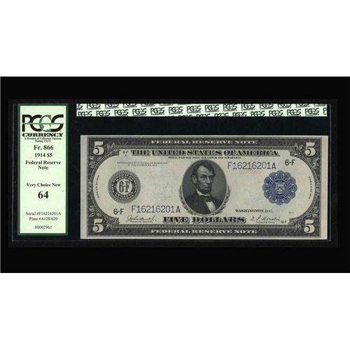 <B>Fr. 866 $5 1914 Federal Reserve Note PCGS Very Choice New 64.</B></I> A very scarce number, with only about 20 examples known in all grades combined. This one is one of the nicest.