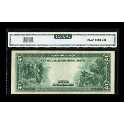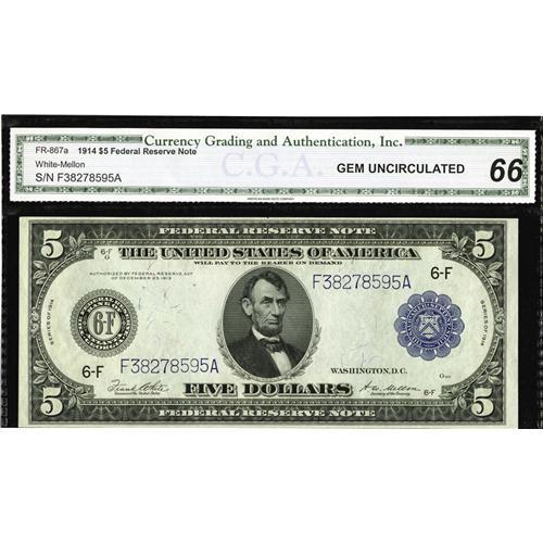 <B>Fr. 867a $5 1914 Federal Reserve Note CGA Gem Uncirculated 66.</B></I> Two CU notes with serial numbers just a few numbers from this piece in both directions are listed in the census. The paper here is still vividly bright.