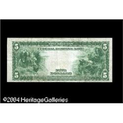 Fr. 867b $5 1914 Federal Reserve Note Very Fine. An <B>Fr. 867b $5 1914 Federal Reserve Note Very Fine.</B></I> An incredibly rare Blue Seal Fed with only four pieces reported prior to the discovery of this note. It is a solid VF, with strictly unmolested surfaces and excellent color for the grade. An ideal "put away" note for the forward-looking collector. <BR><BR><B>Important notice:</B> Heritage usually auctions material at the rate of 200-250 lots per hour. On some occasions eBay Live bid software or the Internet may not be able to keep up with the pace of the auction. We recommend placing a realistic absentee bid now as insurance to avoid disappointment. Occasionally the auctioneer may eliminate or reject an eBay Live bid, and the auctioneer may also reopen a lot after the close of the eBay live bidding (usually because we missed an audience bid), and may reject your bid even if it shows you as the winning bidder. By bidding via eBay Live, you agree that Heritage may award the lot to another bidder at its sole discretion under the circumstances described above or any other reasonable circumstances. Since eBay bids are not shown to us until we open the lot on the floor, we treat those bids just like floor bids. In most cases the floor responds before the eBay bid is presented to us, due to Internet lag time, so for consistency we have made it a policy that floor bids are always considered first over tie eBay live bids. Also please note that all Heritage lots purchased through eBay Live carry a 20% Buyer's Premium. Please make sure you read the Terms and Conditions before you bid. This lot is being auctioned in conjunction with a live floor auction by Heritage Galleries & Auctioneers. All final auction and invoice information will be supplied by Heritage Galleries & Auctioneers, and all other information should be considered preliminary. Lot:17689