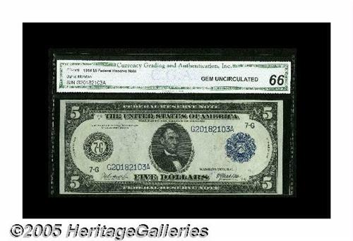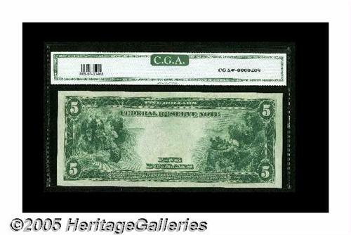 <B>Fr. 868 $5 1914 Federal Reserve Note CGA Gem Uncirculated 66.</B></I> About three dozen examples are known of this number, and few if any can be as nice as this one appears to be.