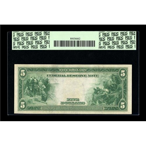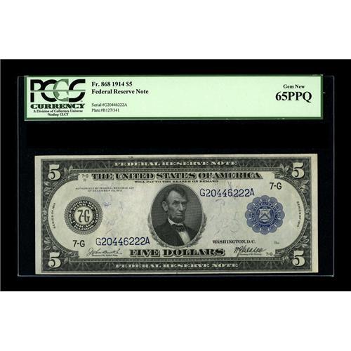 <B>Fr. 868 $5 1914 Federal Reserve Note PCGS Gem New 65PPQ.</B></I> Not a particularly rare note, but certainly not common at this grade level. The original embossing is clearly evident, which is not generally the case on $5 Feds.<BR><I>From The Bill and Kathy Stella Currency Collection</B></I><BR><BR><b>Shipping:</b> Coin/Currency (<a target="_blank" href="http://www.heritageauctions.com/common/shipping.php">view shipping information</a>)