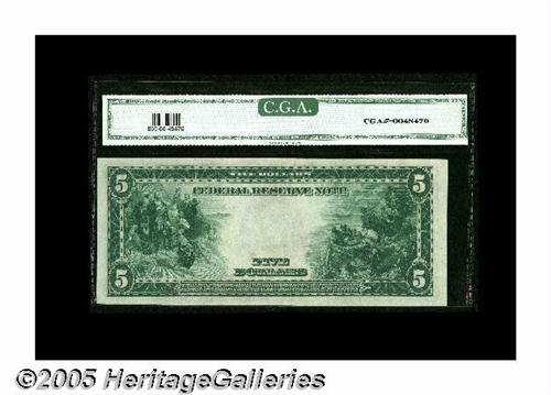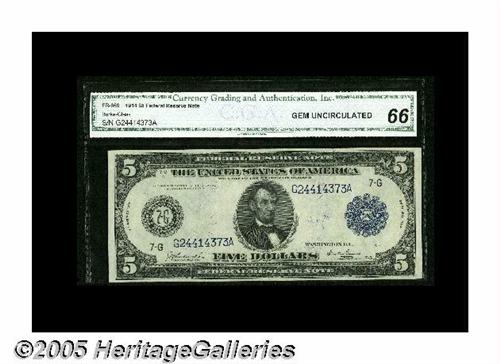 <B>Fr. 869 $5 1914 Federal Reserve Note CGA Gem Uncirculated 66.</B></I> Only about two dozen examples of this number are known in all grades combined, and this well-printed, broadly margined, beautifully bright piece has got to be one of the nicest Burke-Glass signed $5 Chicago Feds.