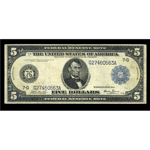 <B>Fr. 869 $5 1914 Federal Reserve Note Fine-Very Fine.</B></I> A decent circulated example with the tough Burke-Glass signatures.