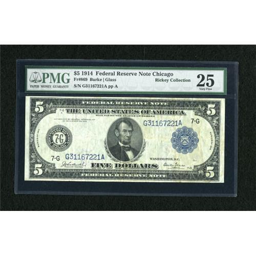 <B>Fr. 869 $5 1914 Federal Reserve Note PMG Very Fine 25.</B></I> Perfectly original paper is seen on this Burke-Glass piece.<BR><BR><b>Shipping:</b> Coins & Currency (<a target="_blank" href="http://www.heritageauctions.com/common/shipping.php">view shipping information</a>)