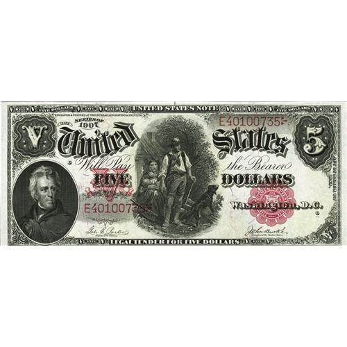 <B>Fr. 87 $5 1907 Legal Tender Choice New.</B></I> The margins on three sides are quite large and sufficient for Gem. So then, the only grade limiting factor on this attractive and brightly colored issue is the tight bottom margin which never intrudes on the design.<BR><I>From The Plymouth Rock Collection</B></I>