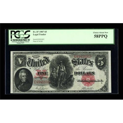 <B>Fr. 87 $5 1907 Legal Tender PCGS Choice About New 58PPQ.</B></I> You will have to look long and hard to determine where the slightest degree of circulation has occurred on this lovely Woodchopper.<BR><BR><b>Shipping:</b> Coins & Currency (<a target="_blank" href="http://www.heritageauctions.com/common/shipping.php">view shipping information</a>)