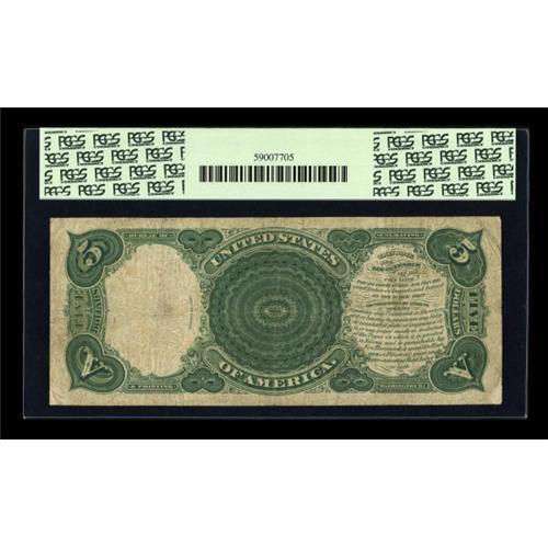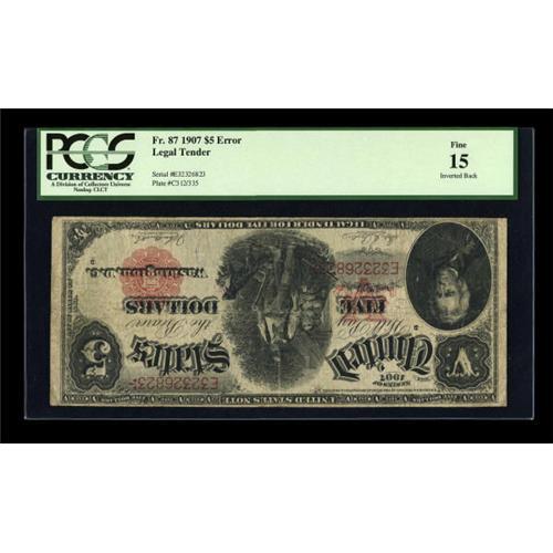<B>Fr. 87 $5 1907 Legal Tender PCGS Fine 15.</B></I> Three inverts have been reported for this Friedberg number. This piece is pleasingly original with solid eye appeal for the grade.<BR><I>From The Amelia Island Collection.</B></I><BR><BR><b>Shipping:</b> Coins & Currency (<a target="_blank" href="http://www.heritageauctions.com/common/shipping.php">view shipping information</a>)