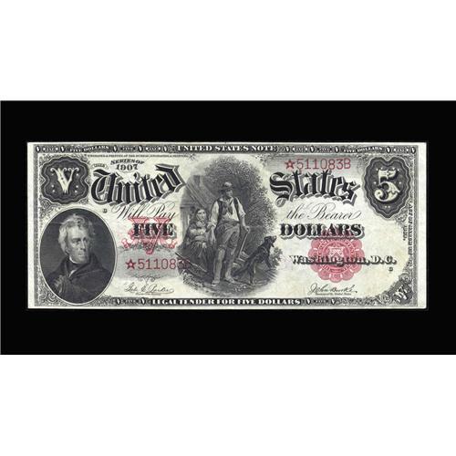 <B>Fr. 87 $5 1907 Legal Tender Star Note Very Fine-Extremely Fine.</B></I> Seven examples of this large size rarity are shown in the Gengerke census. This note last appeared for sale ten years ago. From the Richard Merlau collection, expect this note to realize...<BR><I>From the Large Size Star Note Collection of Richard Merlau</B></I>