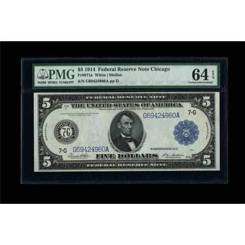<B>Fr. 871a $5 1914 Federal Reserve Note PMG Choice Uncirculated 64 EPQ.</B></I> This is a the second note, and it is as nice as the first.<BR><BR><b>Shipping:</b> Coins & Currency (<a target="_blank" href="http://www.heritageauctions.com/common/shipping.php">view shipping information</a>)