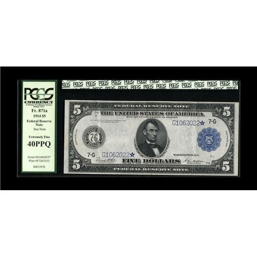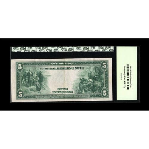 <B>Fr. 871a $5 1914 Federal Reserve Star Note PCGS Extremely Fine 40PPQ.</B></I> One of a few replacement notes in a higher state of preservation from Chicago. Three vertical folds are noticed.